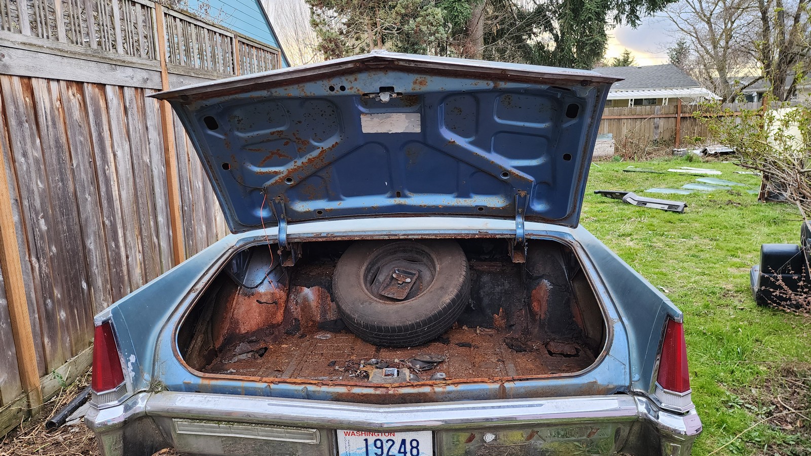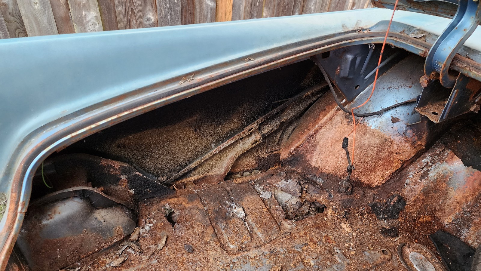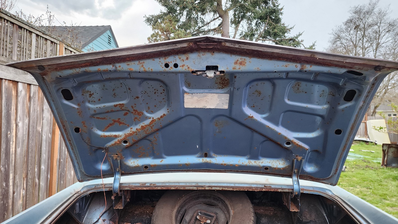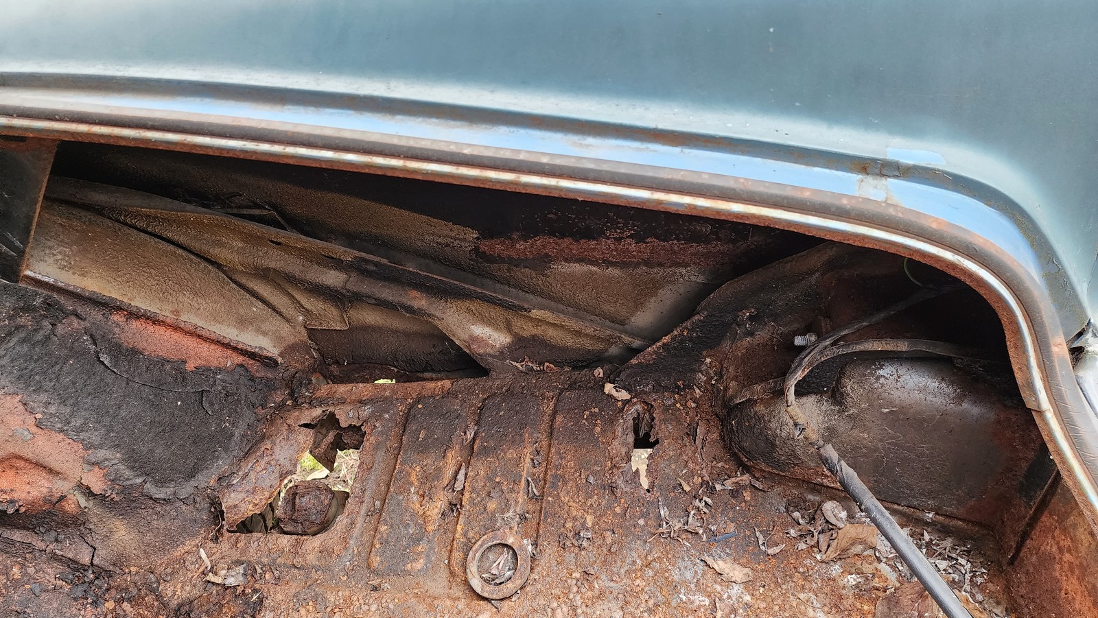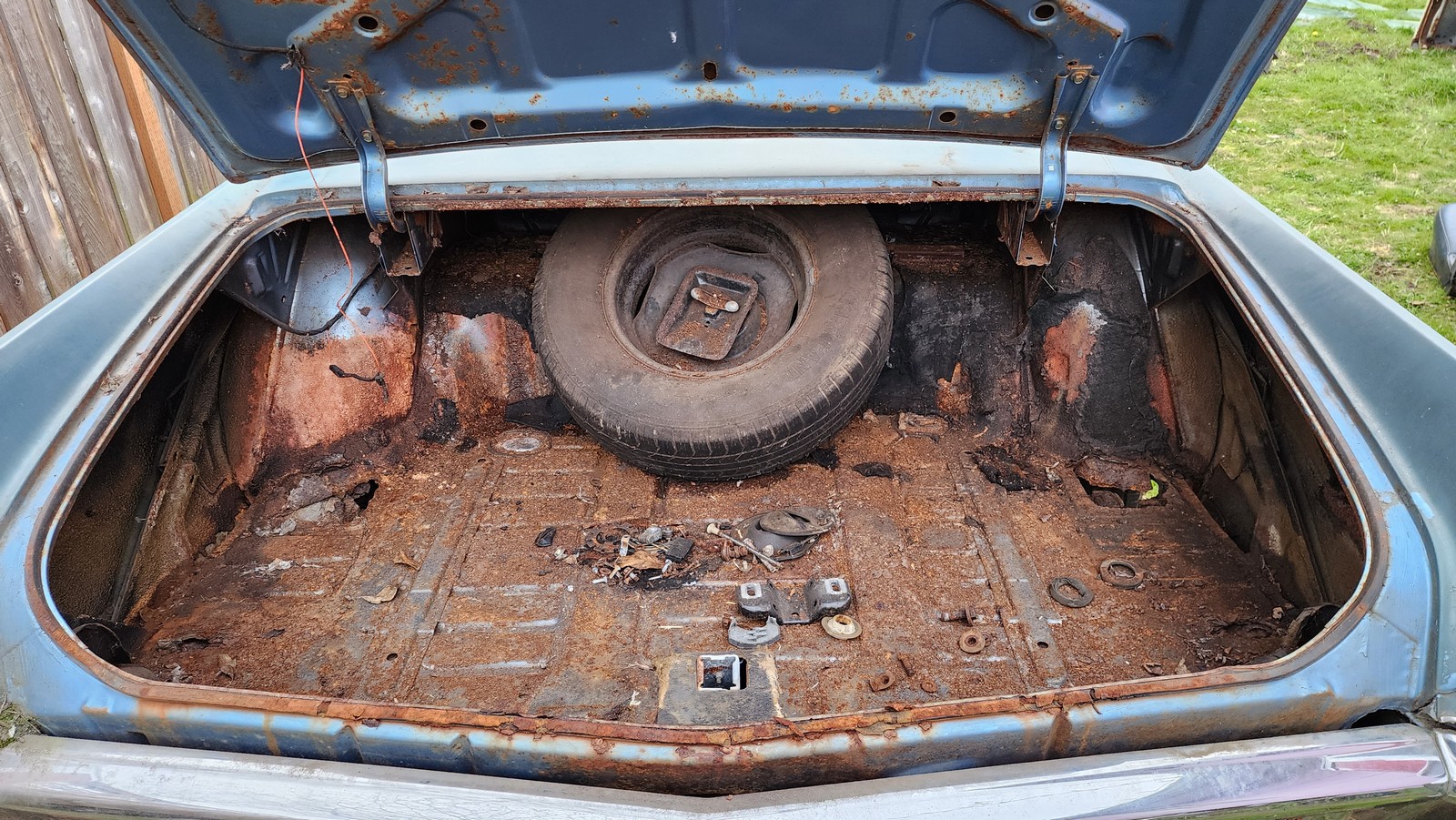 Very rusty throughout. Was running; drove it around the block once. Exterior chrome is in fair to good shape. Mewish tires and good hubcaps. Trunk lid does close and latch, with key.