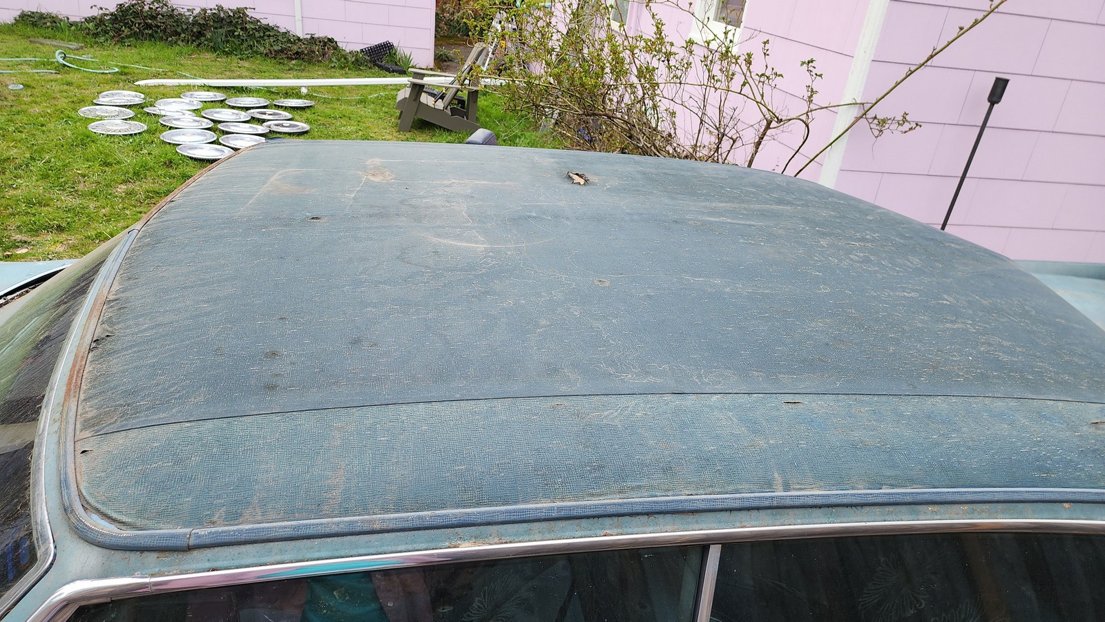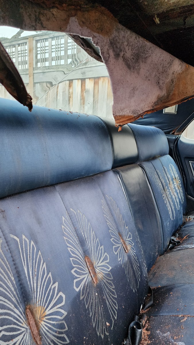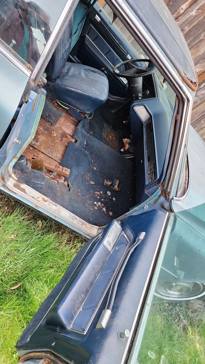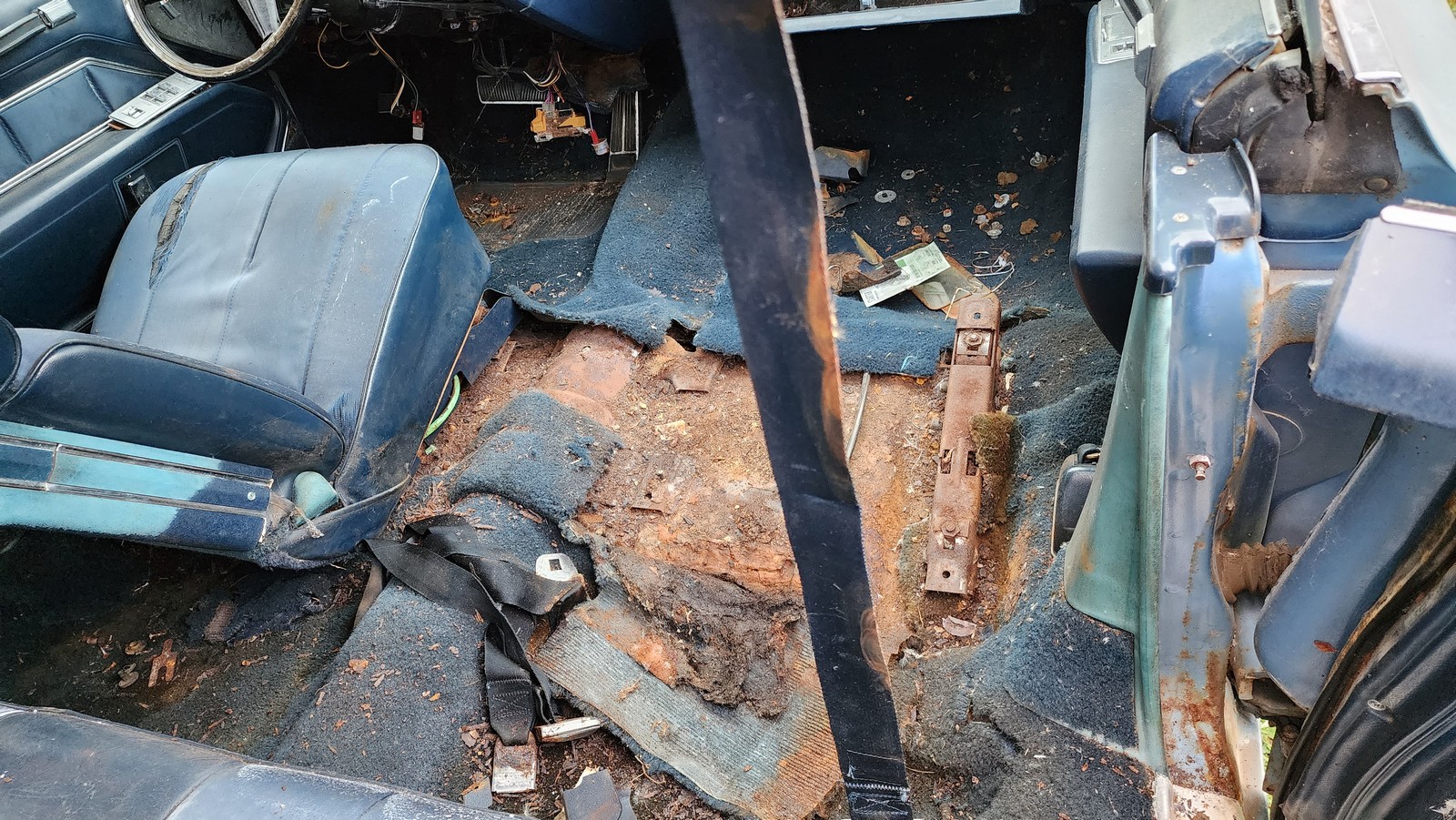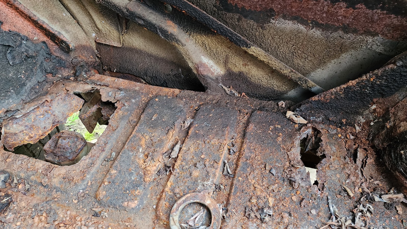 Very rusty throughout. Was running; drove it around the block once. Exterior chrome is in fair to good shape. Mewish tires and good hubcaps. Trunk lid does close and latch, with key.