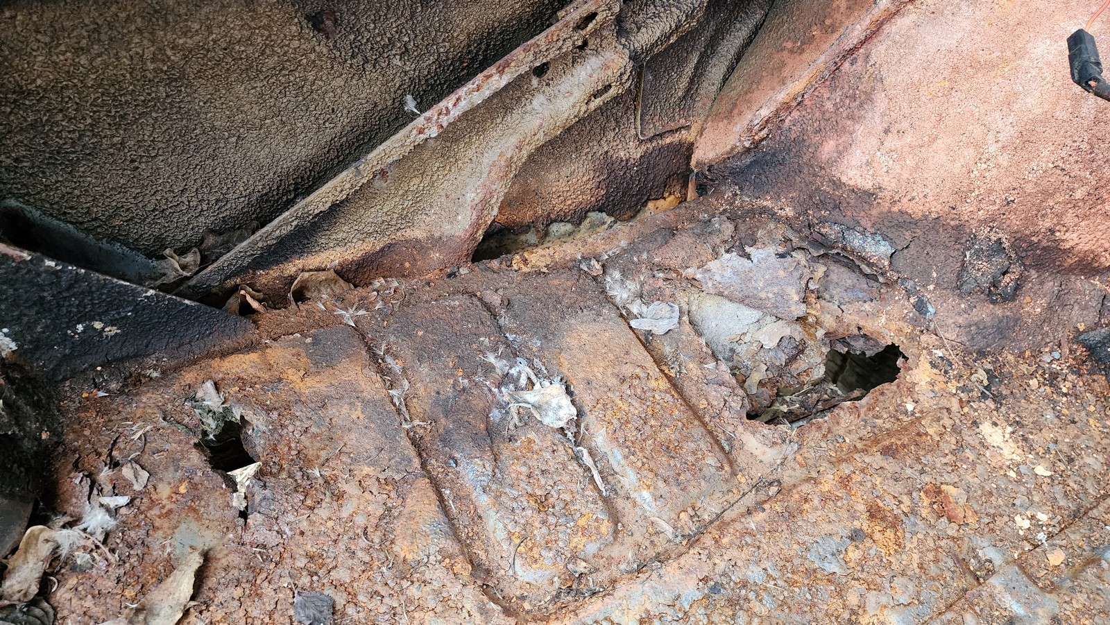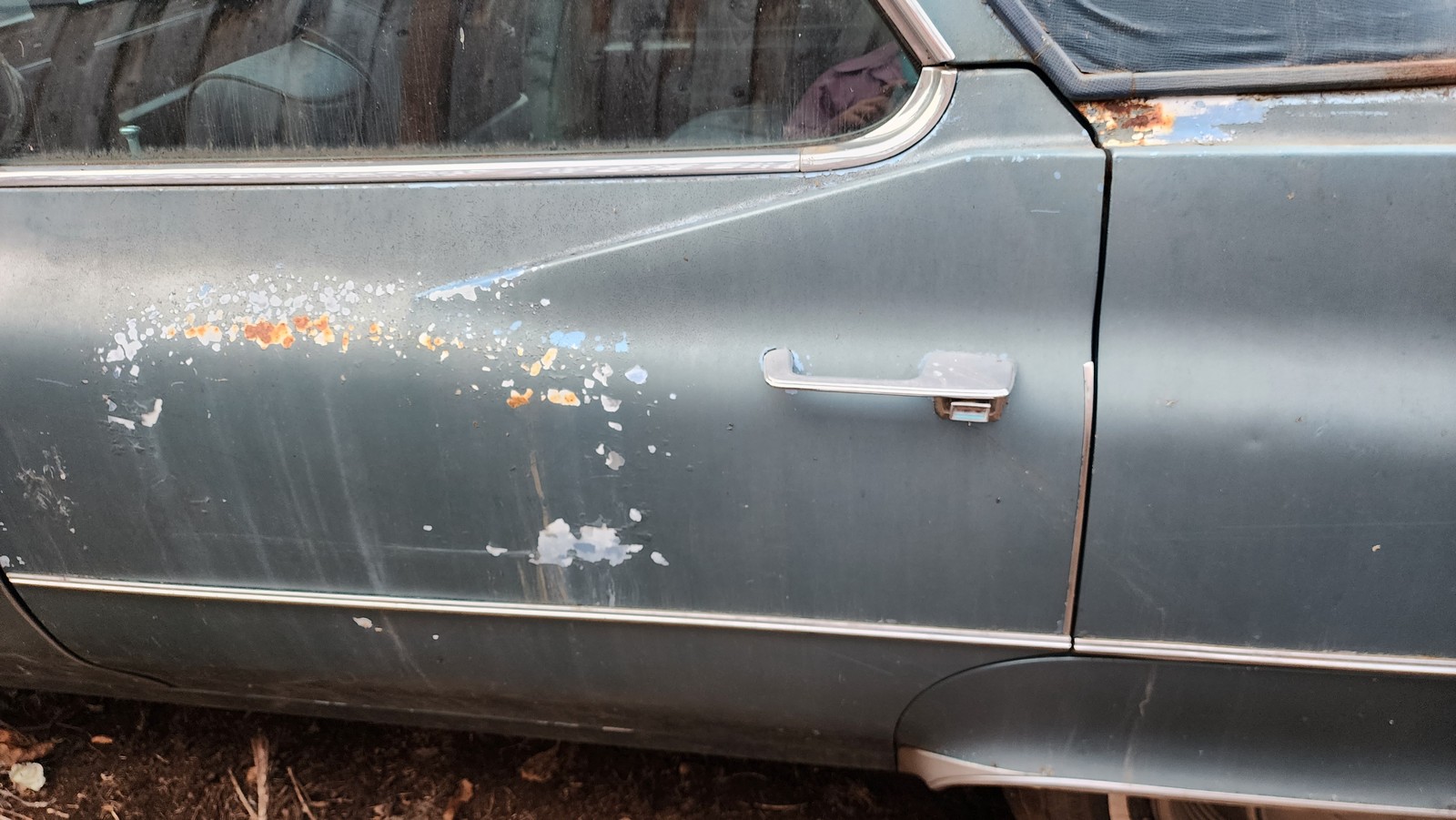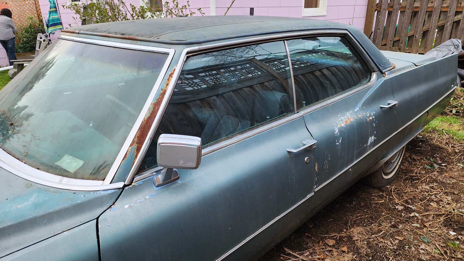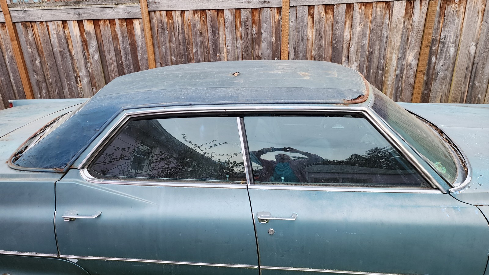 Very rusty throughout. Was running; drove it around the block once. Exterior chrome is in fair to good shape. Mewish tires and good hubcaps. Trunk lid does close and latch, with key.