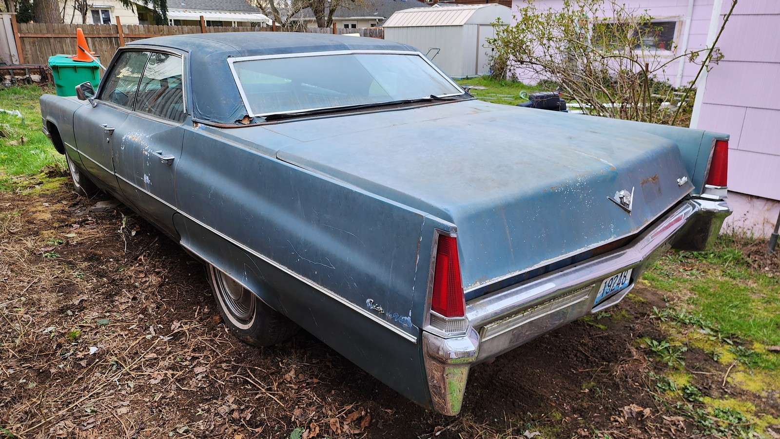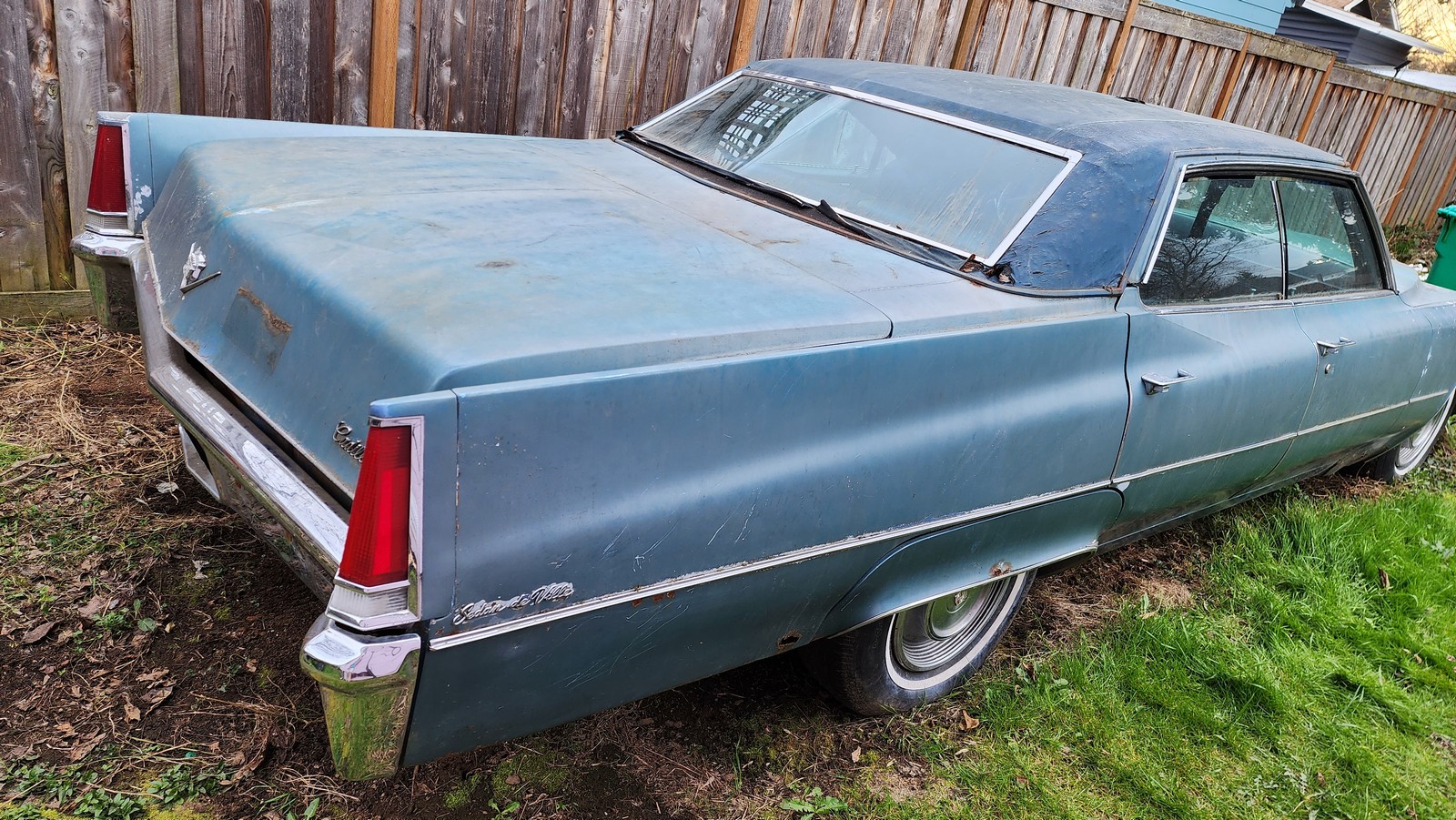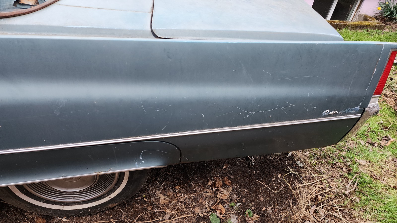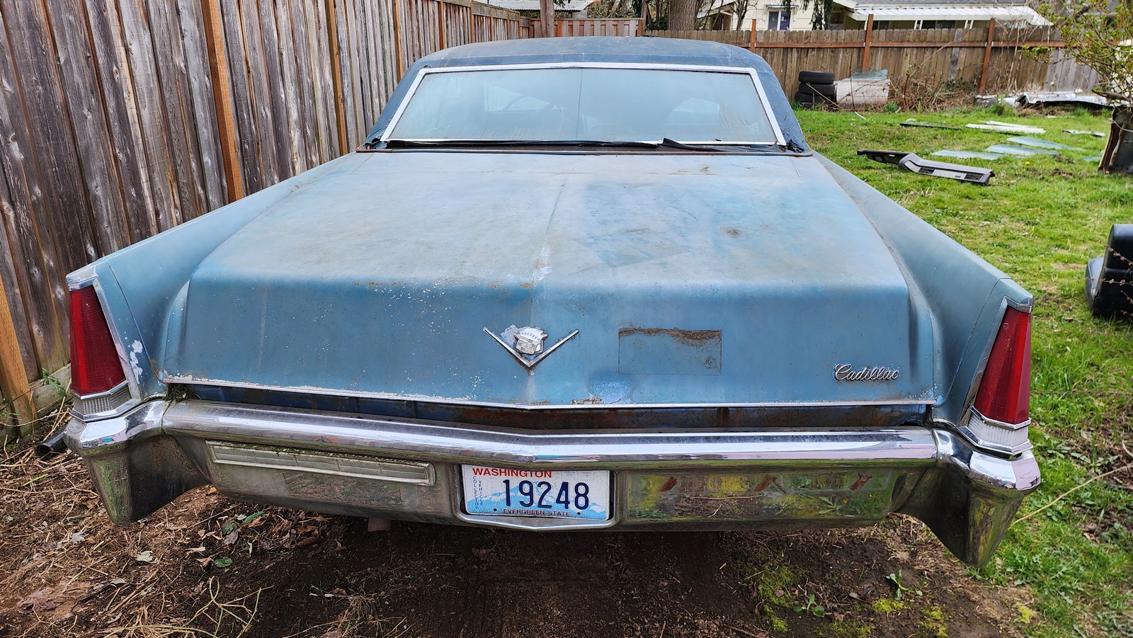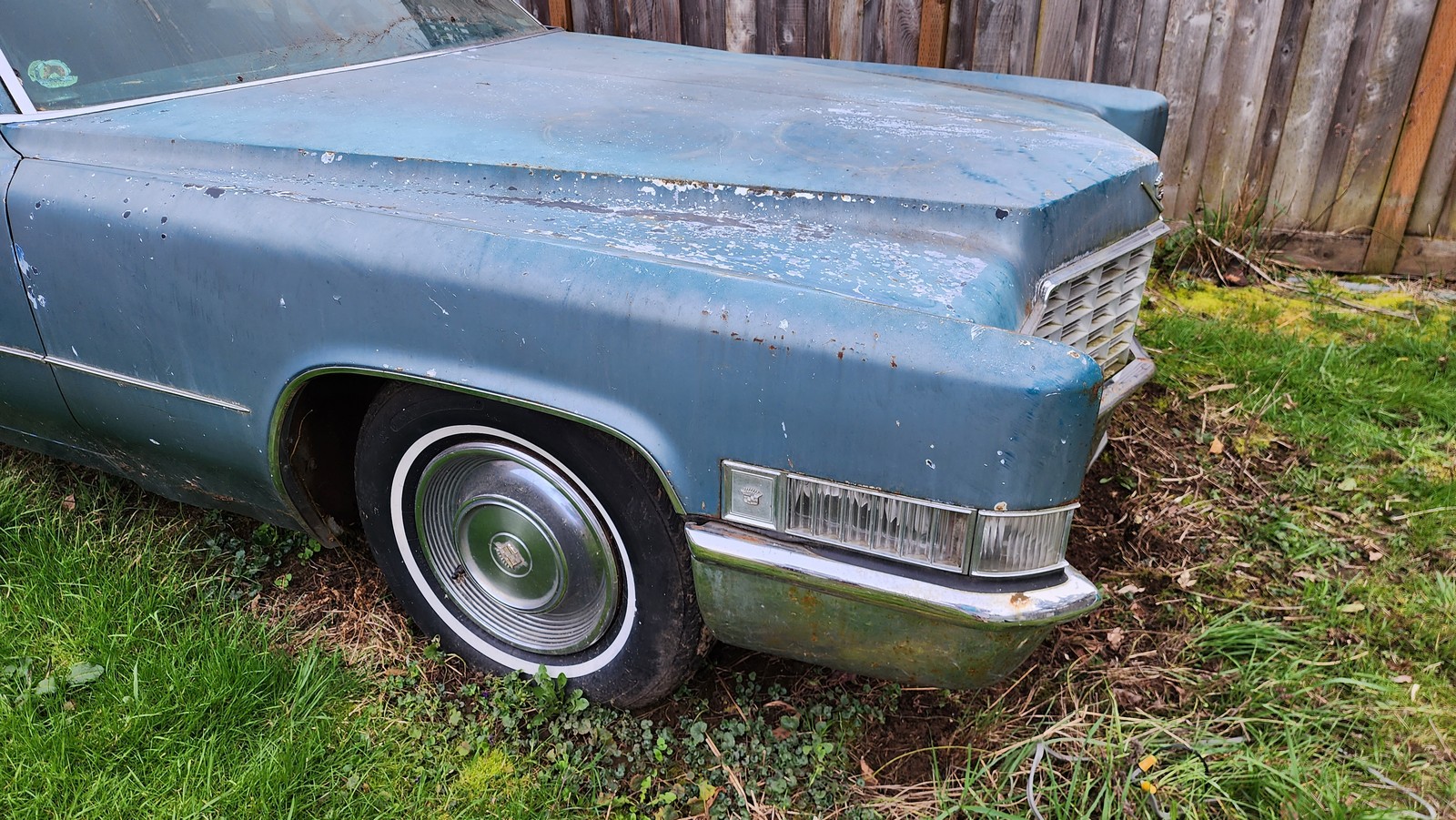 Very rusty throughout. Was running; drove it around the block once. Exterior chrome is in fair to good shape. Mewish tires and good hubcaps. Trunk lid does close and latch, with key.